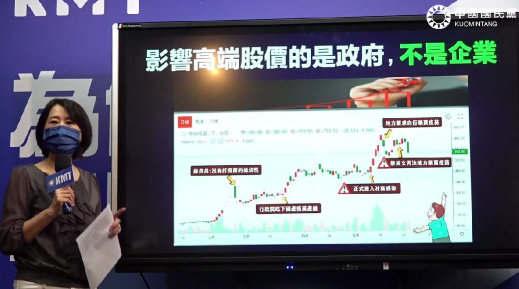 接著更說,高端股價在所有關鍵時刻都出現巨幅波動,當時行政院長蘇貞昌稱台灣沒有打疫苗迫切性,高端立刻下跌後,後來行政院宣布吃下國產疫苗產能,高端股價直線上漲。