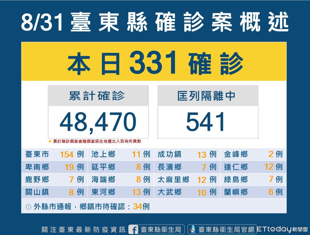 台東縣31日新增331位確診者,297名民眾戶籍或居住地分在台東、34名為外縣市醫院通報。目前台東縣累計確診個案48,470人、居隔者541人。針對COVID-19確診者分流收治情況,台東縣截至8/30下午16點為止,住院收治人數為25、加強版集中檢疫所為17人、居家照護現管人數有1922人。