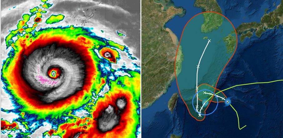 ▲左圖:1日4時紅外線色調強化雲圖顯示,強颱「軒嵐諾」颱風眼清淅可見、結構紮實。(圖擷自tropical tidbits)右圖: 1日2時中央氣象局「路徑潛勢預圖」顯示,第11號強颱「軒嵐諾」在琉球南方海面,偏西南前進,另一「熱帶低壓」在「軒嵐諾」東方,朝西北西前進,兩者將在宮古島南方海面逐漸整併成一個「大型」颱風,移速減慢、滯留打轉;再轉向偏北,經宮古、石垣島附近北上。「不確定性」(紅框)仍很大。(圖/三立準氣象· 老大洩天機)