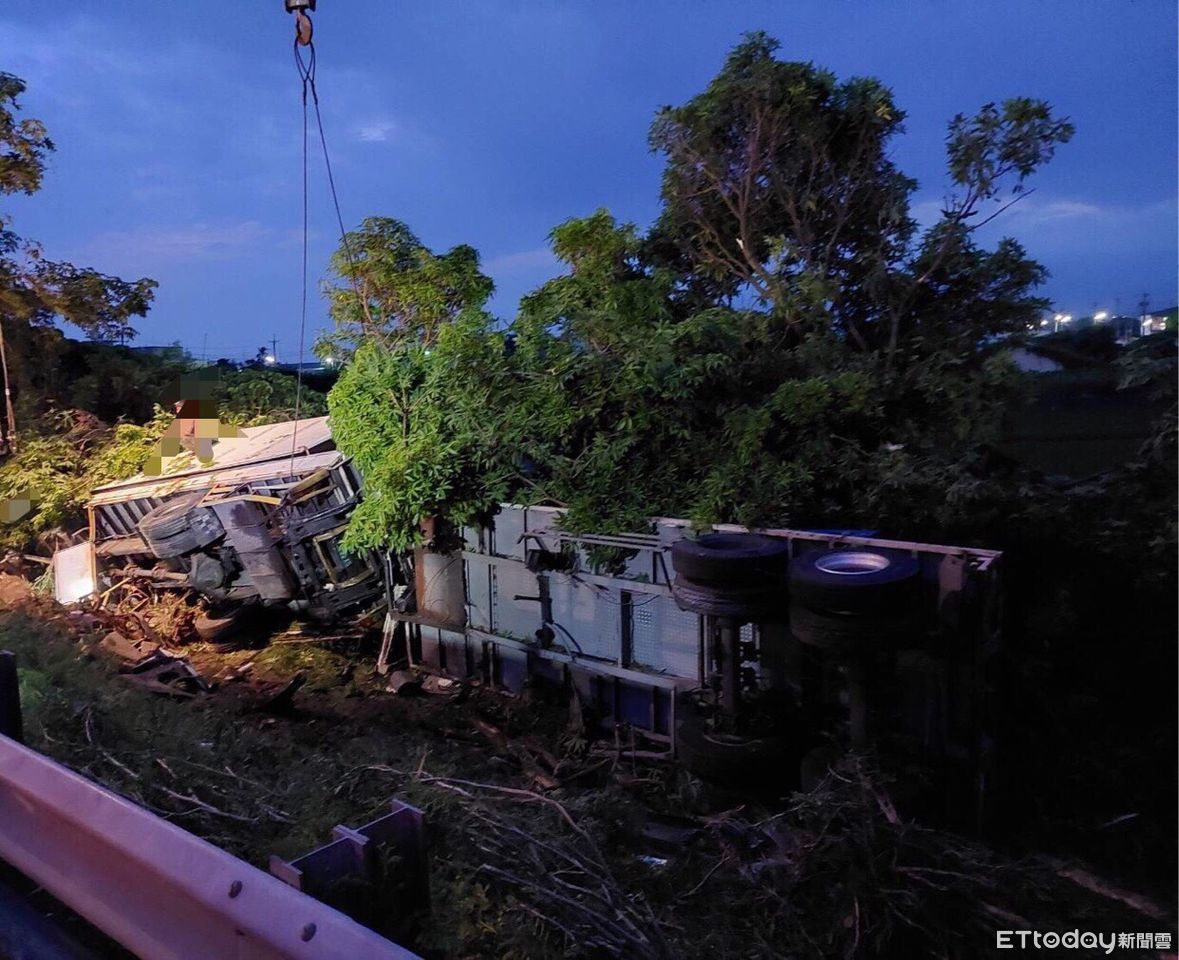 ▲國道1號嘉義民雄段連兩起車禍,槽車衝落邊坡,駕駛意識模糊送醫搶救。(圖/記者翁伊森翻攝)