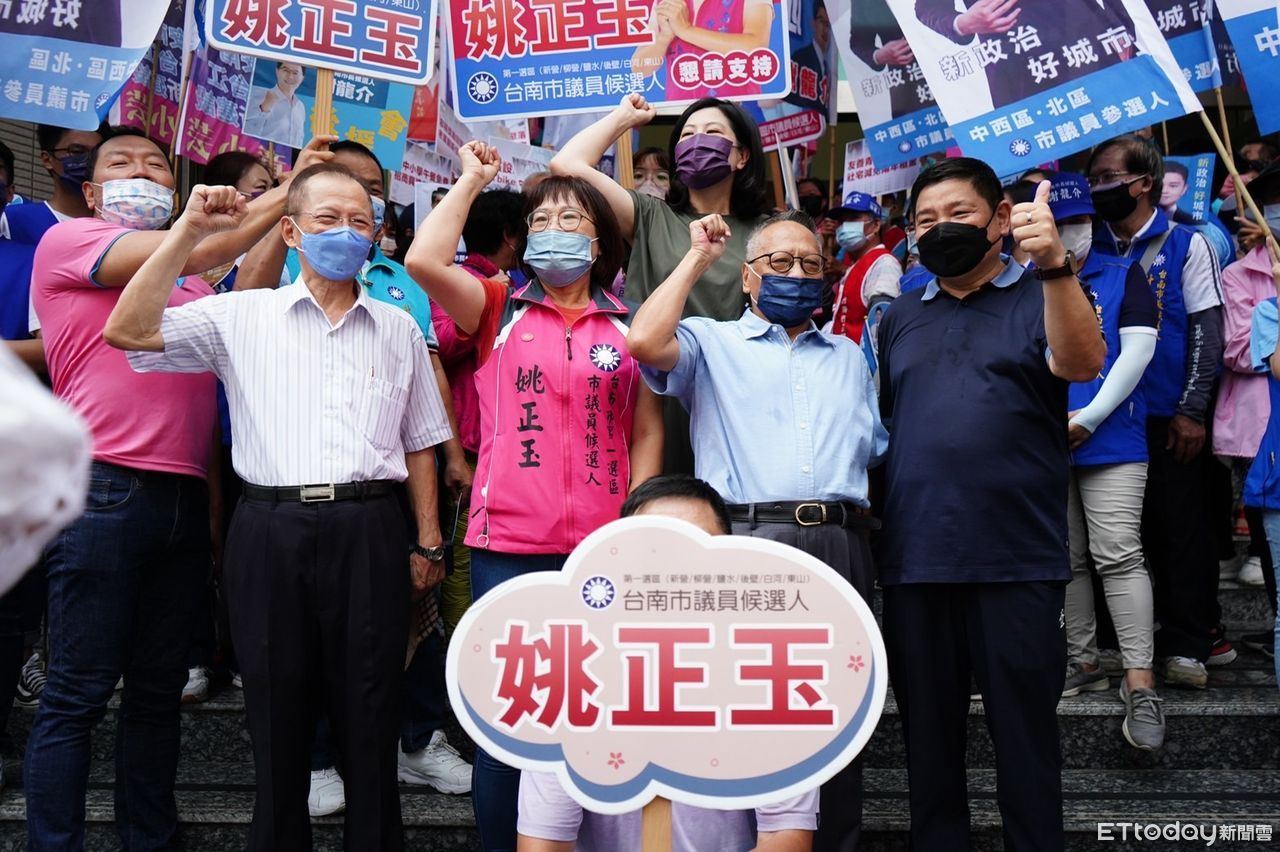 姚正玉1日偕國民黨主席朱立倫、台南市長參選人謝龍介等提名人共同登記,中華日報前社長、老長官莊松旺、台南市新聞記者公會理事長李明威特地前來打氣加油。