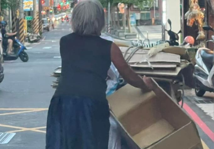 ▲拾荒阿嬤把地上的紙箱撿起來。(圖/翻攝自Facebook/狄志為)