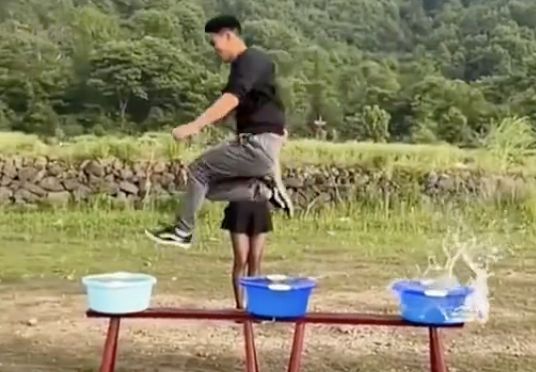透過陳男拍攝的影片可以發現,一張長椅上擺著三盆水,在慢動作展示中,陳男一躍而起,用腳尖輕點水面,點到第三盆水時雖有點取巧踩到水盆邊緣,仍順利完成「蜻蜓點水」的水上漂技能。