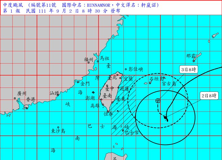 強烈颱風「軒嵐諾」減弱為中颱,中央氣象局今(9/2)上午8時30分發布海上警報,首波警戒範圍為東北部海面、台灣東南部海面、巴士海峽。氣象局預報中心課長林秉煜表示,目前暴風圈有擴大趨勢,今明兩天影響最劇,將來較大雨勢,路徑偏西側一些,有機會發布陸上警報,仍要觀察暴風圈擴大情況,北上過程仍有機會變回強颱。