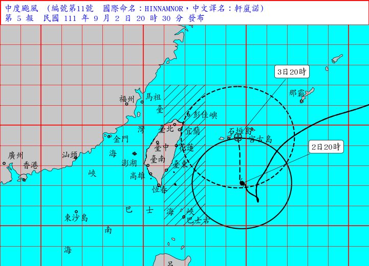 中央氣象局2日晚間表示,中颱軒嵐諾移動相當緩慢,預計最快將在3日凌晨2點30分發布陸上颱風警報,暴風圈預估在3日晚間7時許觸陸,範圍包含台北市、新北市、基隆市及宜蘭縣。