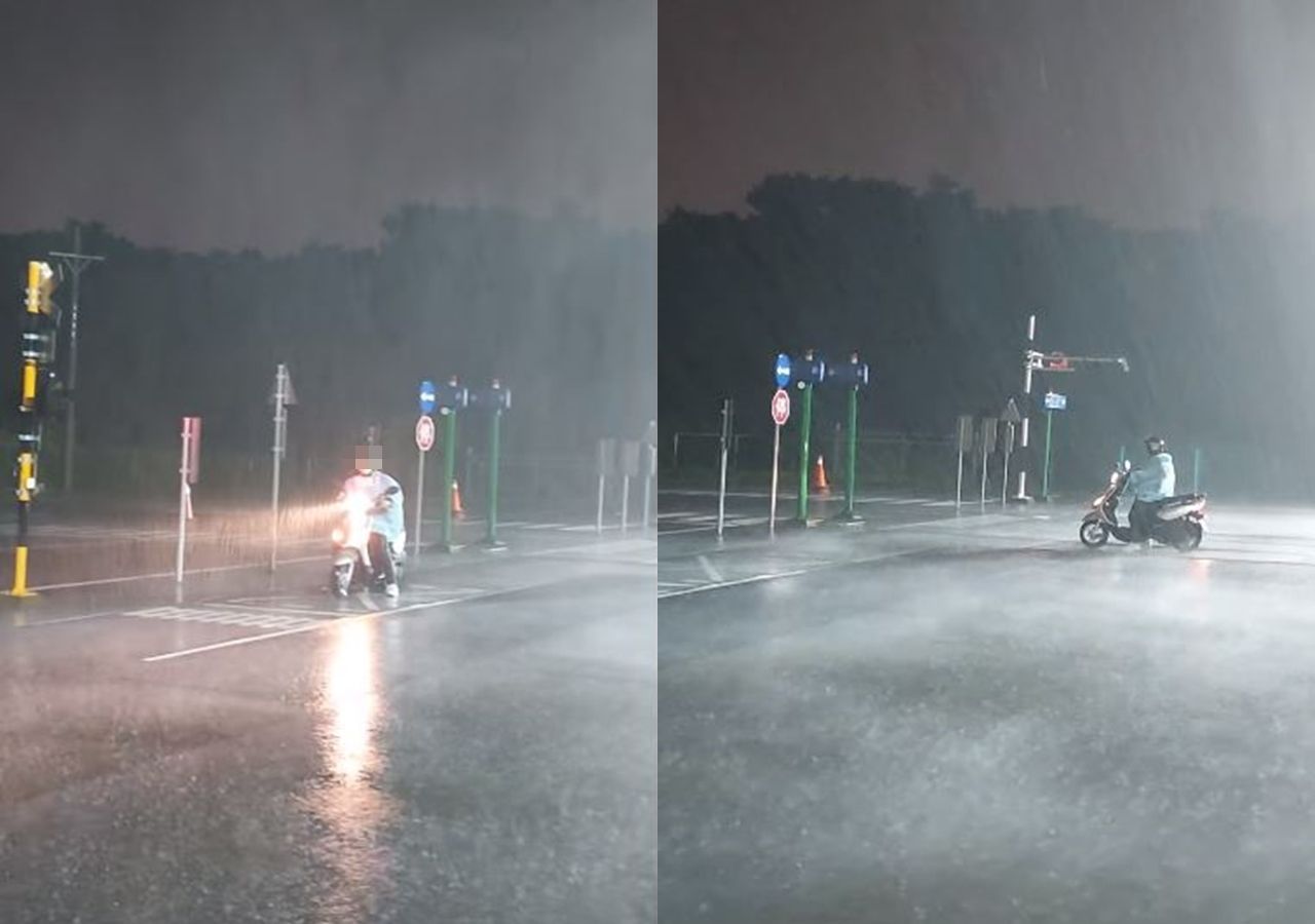 影片可以看見,當時天色已晚,由於正逢軒嵐諾靠近,外圍環流帶來強大風雨,女騎士身穿雨衣在傾盆大雨中努力練車,認真做出「左右擺頭,察看是否有左右車」等動作。