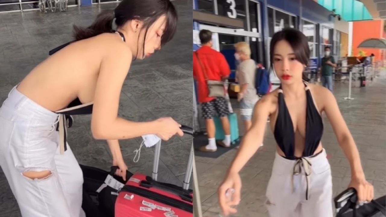 近日一支影片拍下,一名正妹女遊客穿著超火辣,背部全裸還露出側乳,推著行李箱在機場,吸引超過16萬次瀏覽,而這位正妹正是泰國知名DJ芭比莫絲(Barbie Mozz)。