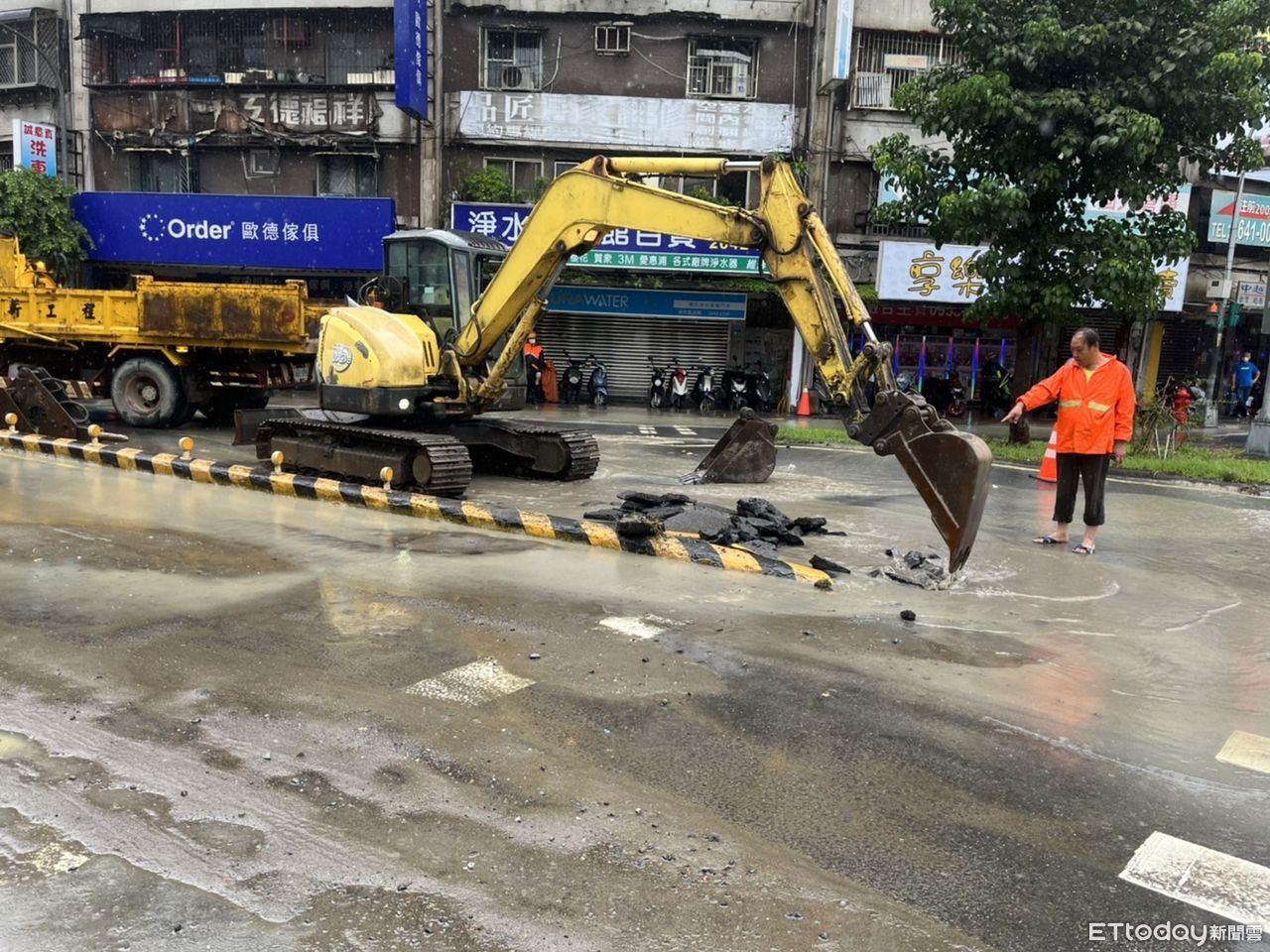 ▲4日上午汐止經中興路大同路口自來水管線滲漏造成積水,相關單位派員搶修中。(圖說下同/記者張君豪翻攝)