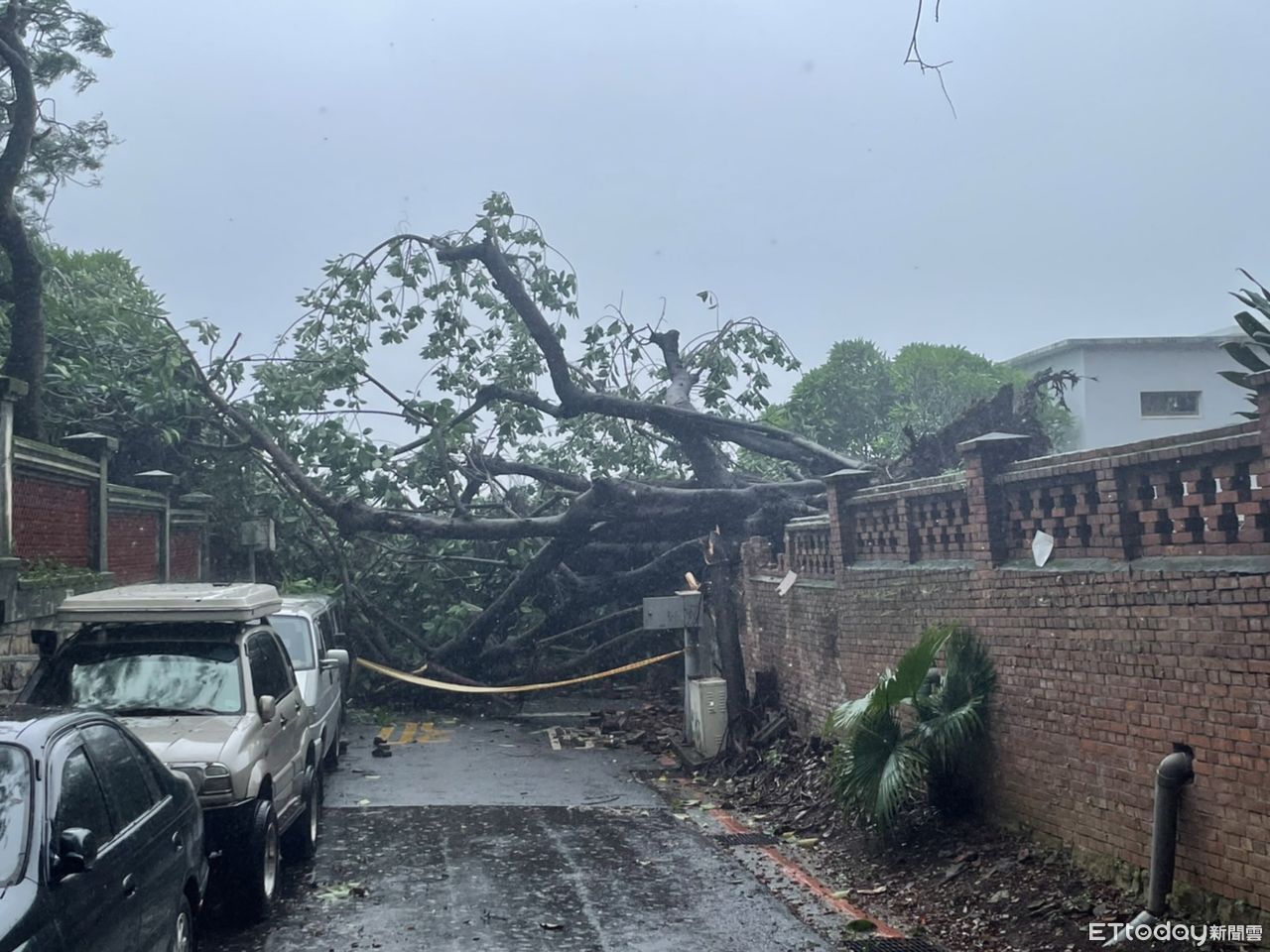 ▲ 校內路樹倒塌,壓垮真理大學圍牆 。(圖/記者戴上容翻攝)