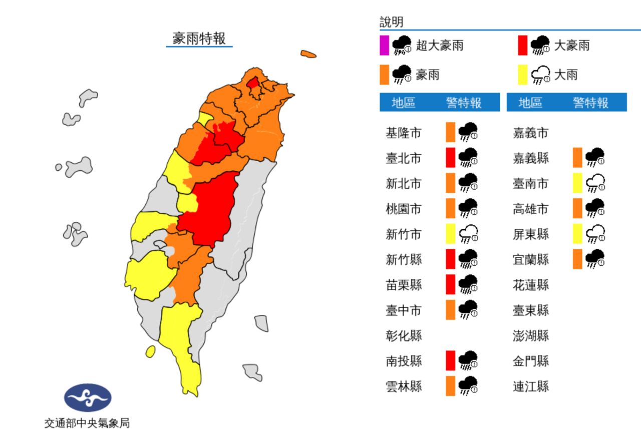 豪雨:基隆北海岸、臺北市、新北市、桃園市、新竹縣、苗栗縣、臺中市山區、雲林縣山區、嘉義縣山區、高雄市山區、宜蘭縣