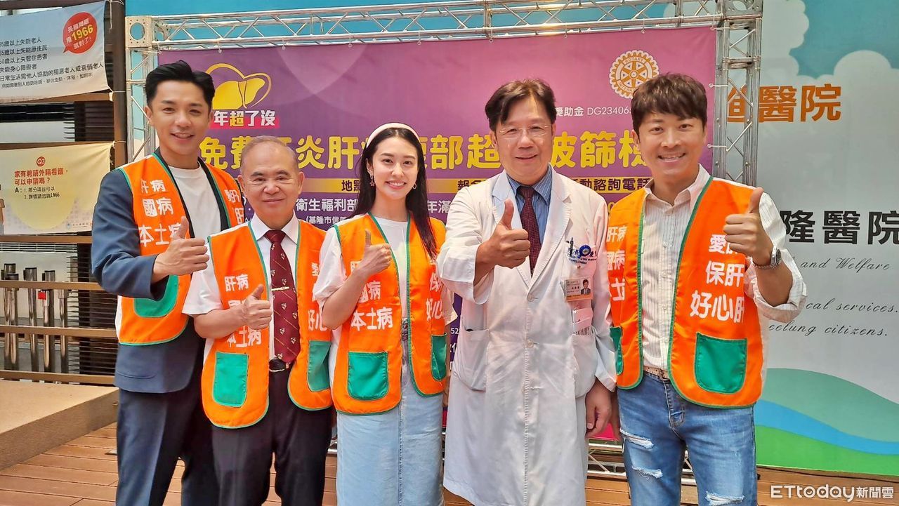 ▲國際扶輪傳愛「根除台灣肝病計畫」。衛福部基隆醫院林慶豐院長(右2)、節目主持人侯昌明(右1)、藝人楊皓崴(左1)、藝人張郁婕(左3)。(圖/記者郭世賢翻攝,下同)