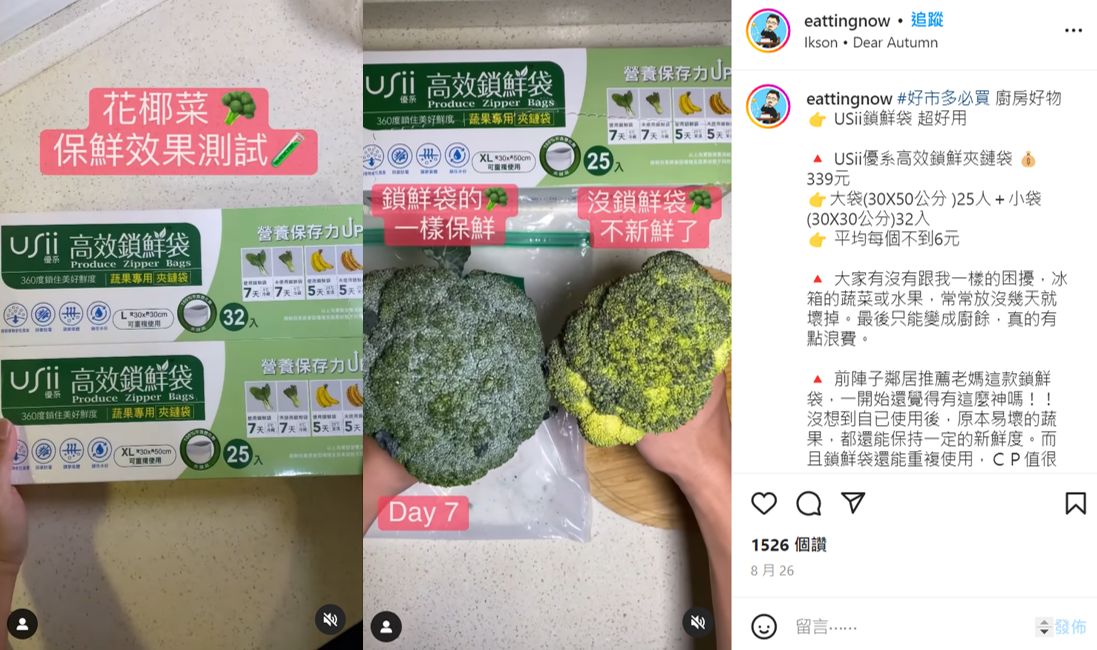 為避免菜價影響中秋吃好料的採購量,關鍵撇步就在「鎖住鮮度」才能吃的盡興又能守住荷包!近期網友eatingnow就在IG上發布一則影片實測「花椰菜保鮮效果測試」,他將花椰菜裝入USii高效鎖鮮袋及完全不裝保鮮袋兩種方式做對比,觀察食材一周內的保存情形。