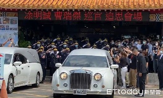 台南市警二分局警員凃明誠及曹瑞傑因公殉職的公祭儀式,於5日近12時圓滿完成,2位員警的英靈在禮儀人員及警察儀隊人員引領家屬下,登上靈車,台南市警局代表在會場門口列隊敬禮送行,任務結束,願2位員警一路好走,場面莊嚴盛大哀戚。