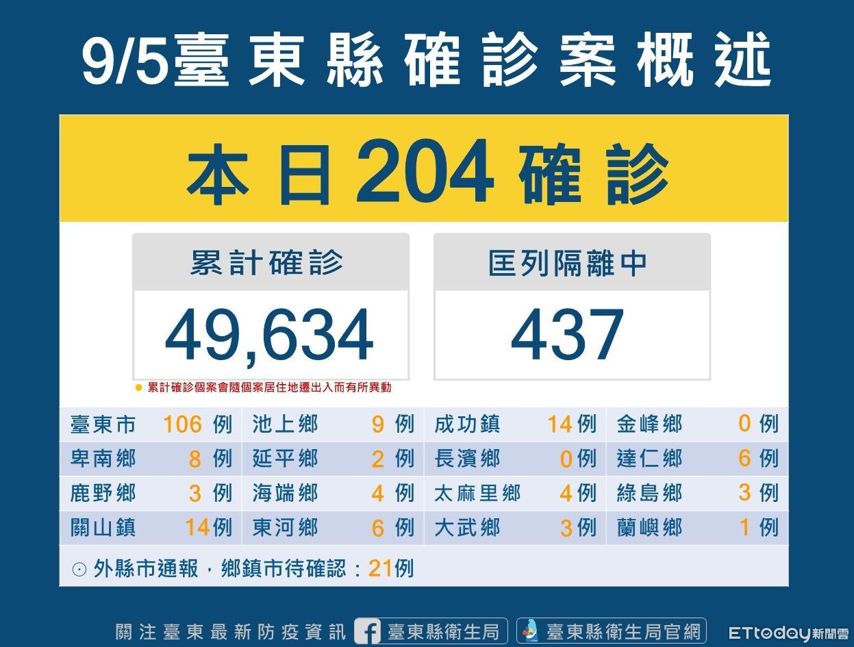 台東縣5日新增204位確診者,183名民眾戶籍或居住地分在台東、21名為外縣市醫院通報。目前台東縣累計確診個案49634人、居隔者437人。針對COVID-19確診者分流收治情況,目前台東縣截至9/4下午16點為止,住院收治人數為22、加強版集中檢疫所為26人、居家照護現管人數有1850人。
