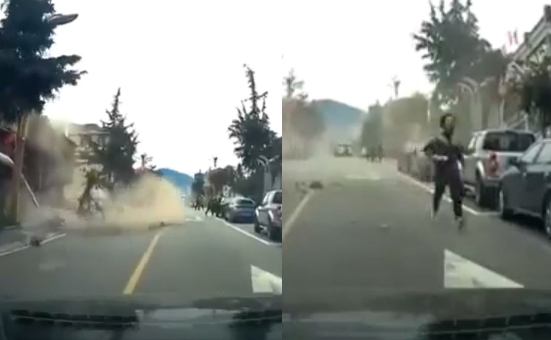 微博和推特流傳一段行車紀錄器拍下的影片,地點在震央磨西鎮貢嘎大道,一名男子開車載著車上2名女子,從風景區停車場剛離開,原先車內還在閒聊,下秒突然遇到6.8強震爆發,路樹猛搖,建物上的輕鋼架疑似廣告招牌砸落路面。
