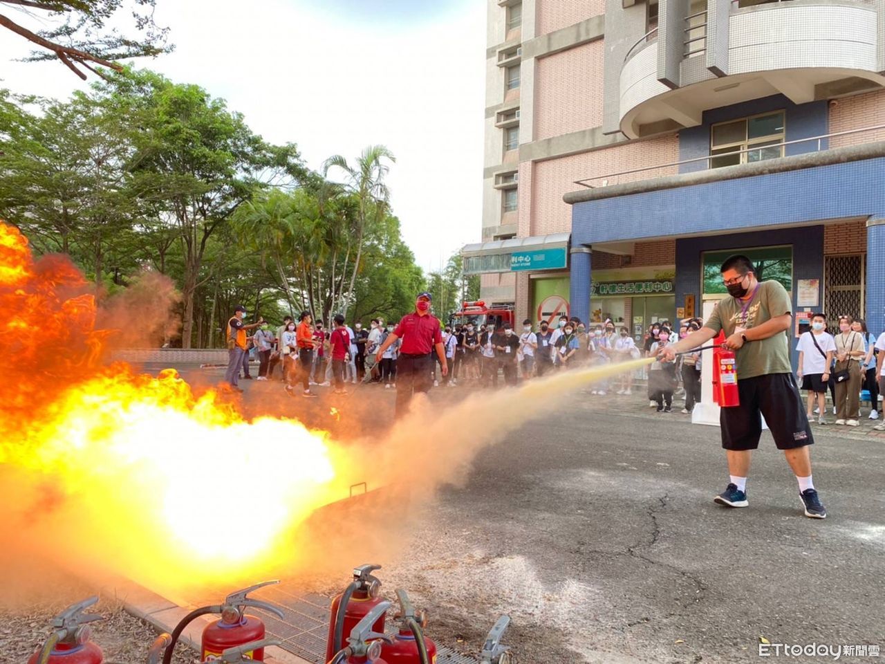 消防局說明,此次指導新生包含緊急急症辨識、心肺復甦術加AED操作、防火防災知識、滅火器、室內消防栓操作及使用時機等知識;並展示消防人員各式器材操作、消防衣著裝、佈線及射水等執行技能,除讓參與的學生對消防工作有更深刻的認識外,更能學習當面對災害時,該如何冷靜應變、守護周遭的人。