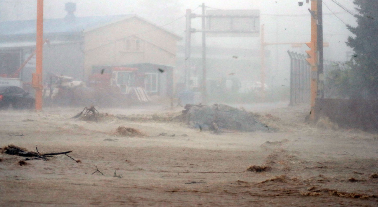▲颱風軒嵐諾侵襲南韓,慶尚北道浦項市到處淹大水。(圖/達志影像/newscom)