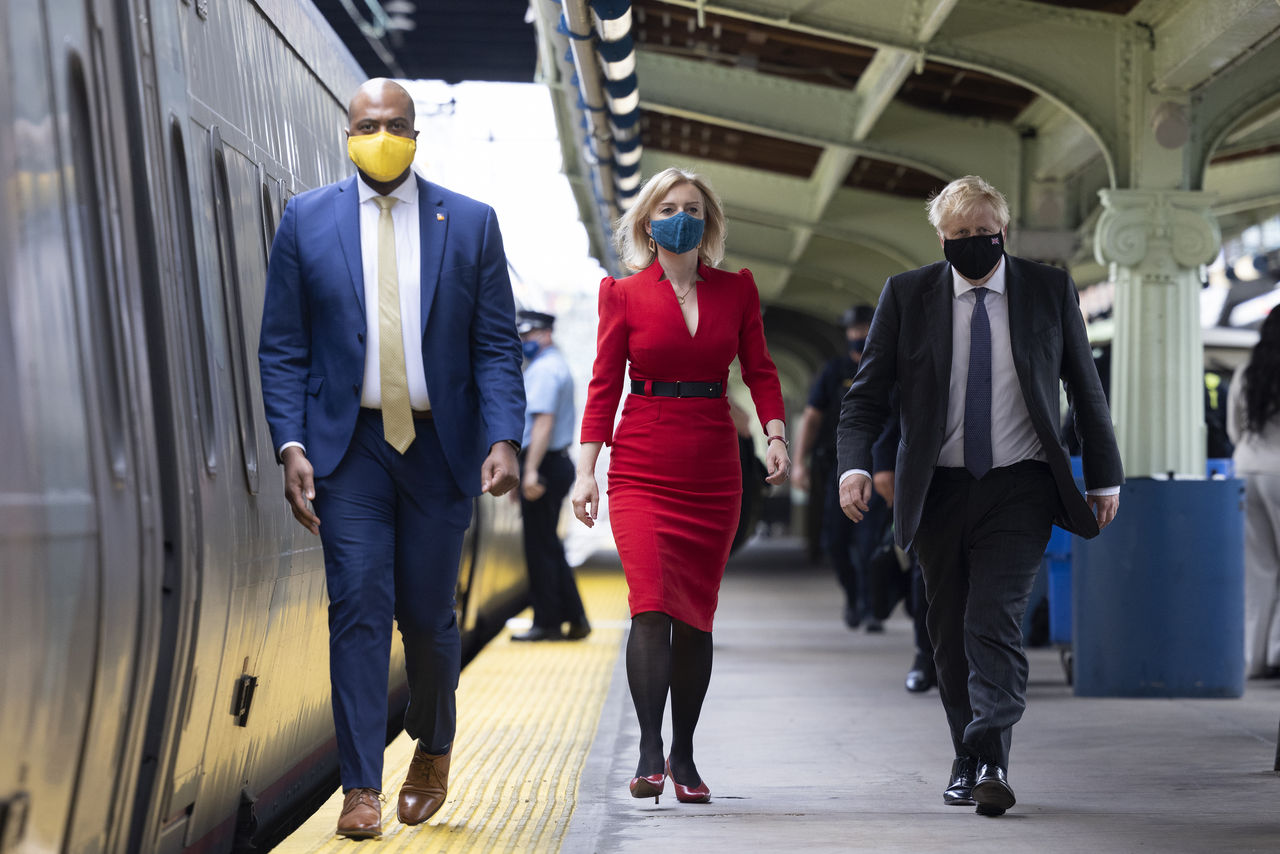 ▲英國新首相特拉斯(中)與前首相強生(右)。(圖/達志影像)