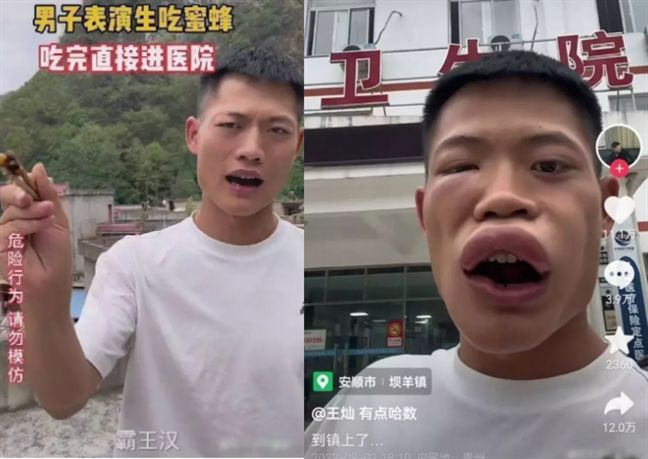 大陸之前有網紅吃大白鯊被查,這次有網紅為博點閱不惜「自殘」。9月2日,貴州安順一男網紅用生命直播,表演生吃蜜蜂,影片走紅網路。結果他嘴巴瞬間被蜇成「香腸嘴」,眼睛面部腫脹,說話漏風,連吃飯也只能喝稀飯。目前,該帳號已經被平台封號。