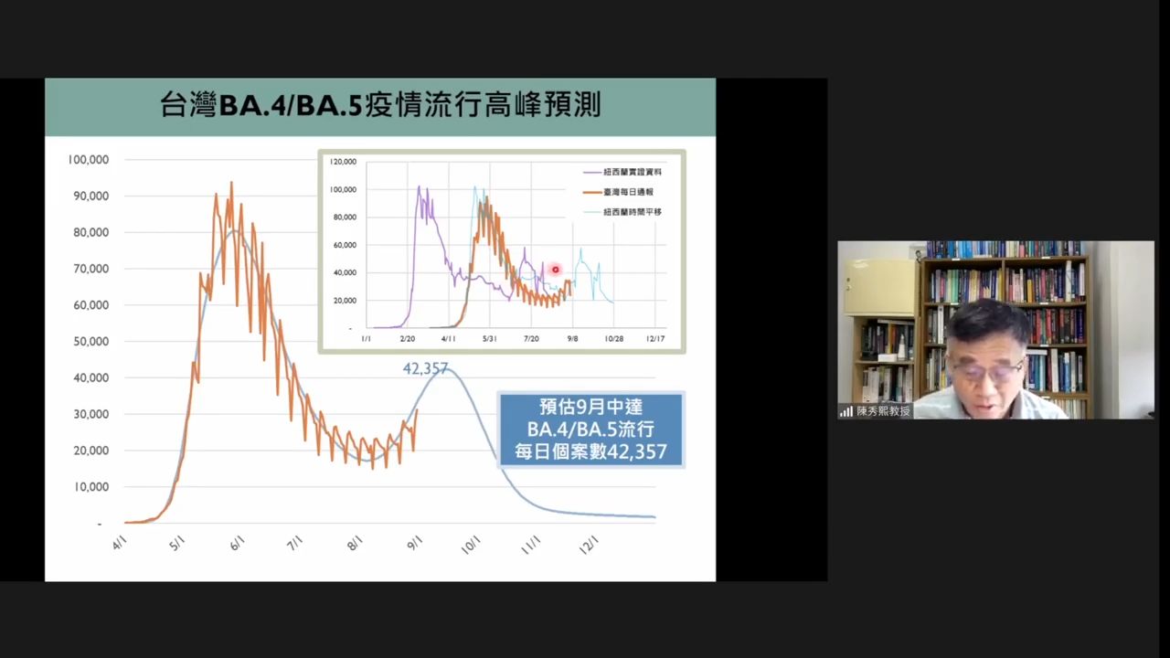 觀察與台灣疫情趨勢相像的紐西蘭,陳秀熙團隊預估,國內將在9月中旬達第一次高峰,每日新增個案數為42357人。不過他也強調,這些個案大部分都是輕症突破性感染,對50歲以下族群而言,是免疫保護力的最佳火車頭。