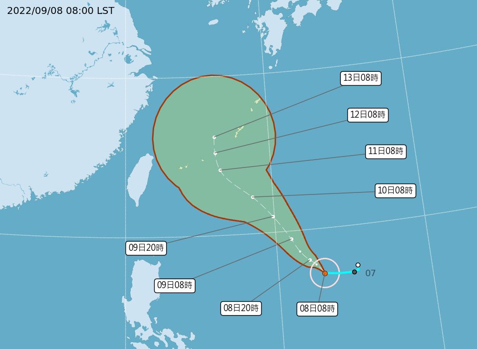 氣象局預報員朱美霖表示,梅花颱風目前位於鵝鑾鼻東南東1400公里的海面上,下週日前會逐漸接近琉球南方近海,週日以後速度減慢並北轉,下週一、二往北移,下週三前離台灣都是相對接近,須留意海上風浪。