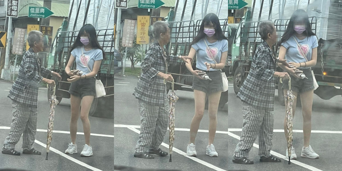 一名男網友在臉書《爆廢公社》透露,今開車等紅燈時,直擊一名老奶奶手持雨傘正準備要過馬路,結果下秒冒出一位長髮正妹,她一邊弓起手肘,一邊主動攙扶老奶奶,而老奶奶也緩緩抓住他的手腕,這感人一幕讓原PO暖上心頭。