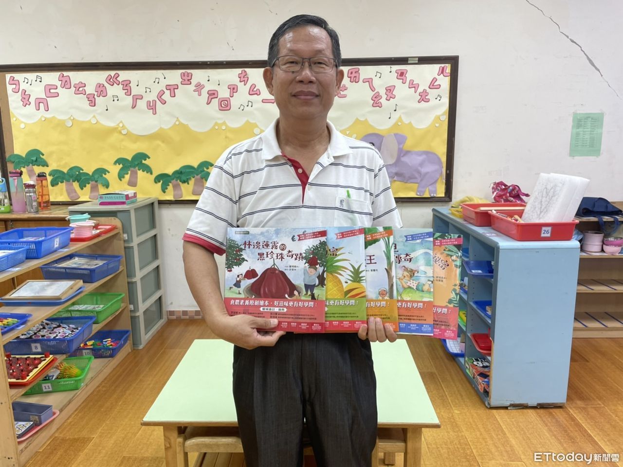 ▲中華醫大幼保系鄭博真教授與他創作的臺灣水果有學問系列5本繪本,以芭樂、香蕉、柚子、鳳梨和蓮霧增加孩童對台灣水果的認知。(圖/記者林悅翻攝,下同)