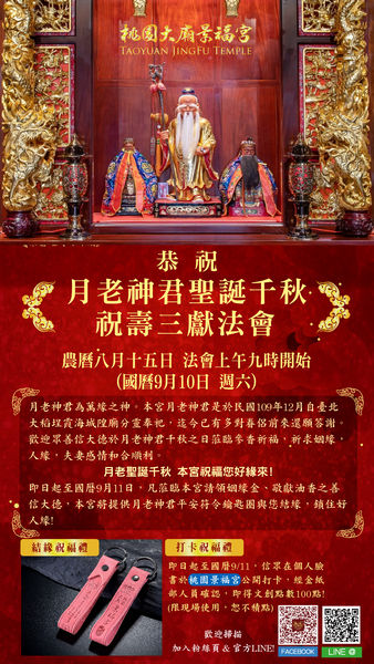 今天是農曆中秋節,也是神界的月老神君聖誕日。桃園區大廟景福宮主委簡征潭10日指出,未婚男女想求姻緣,於吉時來拜月老神君,有助未婚年輕朋友早日覓得良緣。景福宮同時也在今天舉辦未婚男女聯誼活動,吸引90對未婚男女報名,相當熱絡,期提升桃園結婚率。