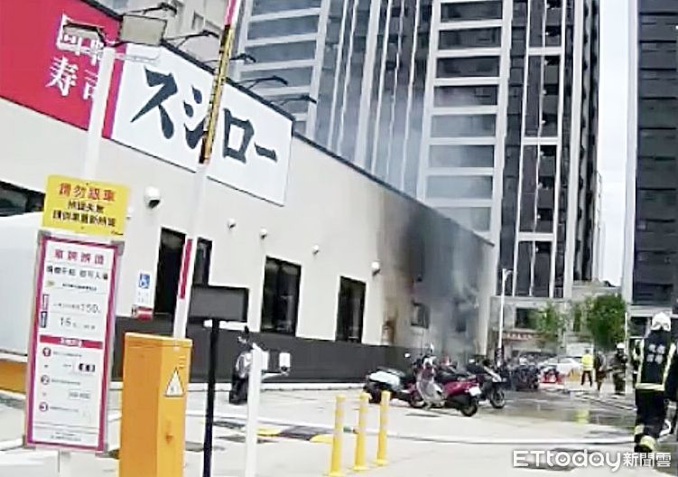 ▲14輛機車經過大火後剩下焦黑骨架,壽司郎大樓外牆壁也被燒黑。