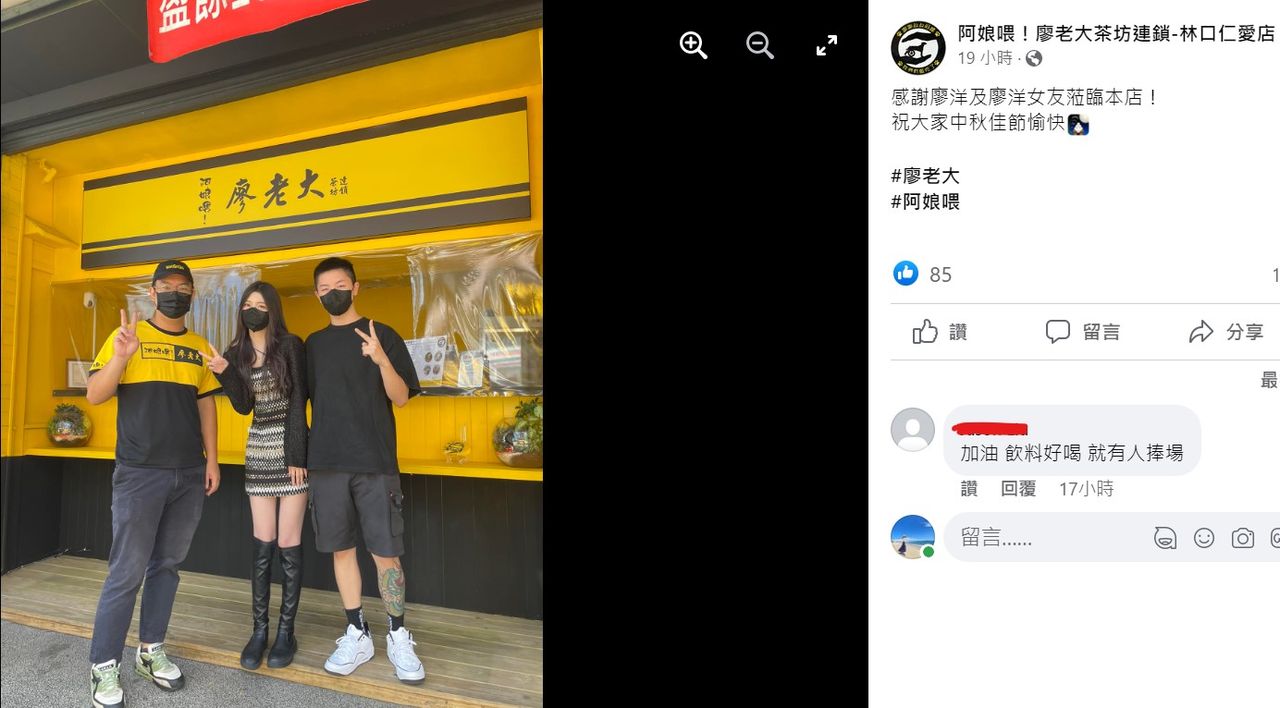 實際上「阿娘喂!廖老大茶坊」林口仁愛店臉書查詢,就可看到店家貼上與廖老大兒子廖洋及廖洋女友的合照,時間點與網友在「爆廢公社公開版」貼文時間相符合。