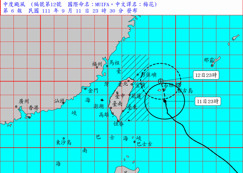 中度颱風「梅花」(Muifa)速度持續減慢,目前路徑朝偏北北西移動,中央氣象局指出,明天(12日)颱風更靠近台灣,雨勢更明顯,其暴風圈正逐漸進入台灣東半部海面,對東半部及北部海面構成威脅,依據預估路徑,梅花發布陸警機率漸低,今(11日)深夜11時30分氣象局有最新海上警報說明。