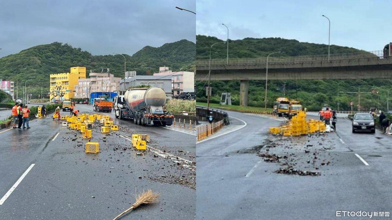 新北市瑞芳區台二線東向18.7公里處今(12日)上10時許發生一起意外事故,54歲吳姓男子駕駛一輛大貨車載運玻璃瓶裝啤酒,行經該路段基隆往宜蘭方向時,因未將貨物綑綁好,疑因過彎離心力過大,造成大量玻璃啤酒瓶散落到路面,所幸吳男沒有受傷。瑞芳警分局獲報派員趕抵現場,實施交通管制,目前雙線封閉一線道,基隆工務段已到場清理。