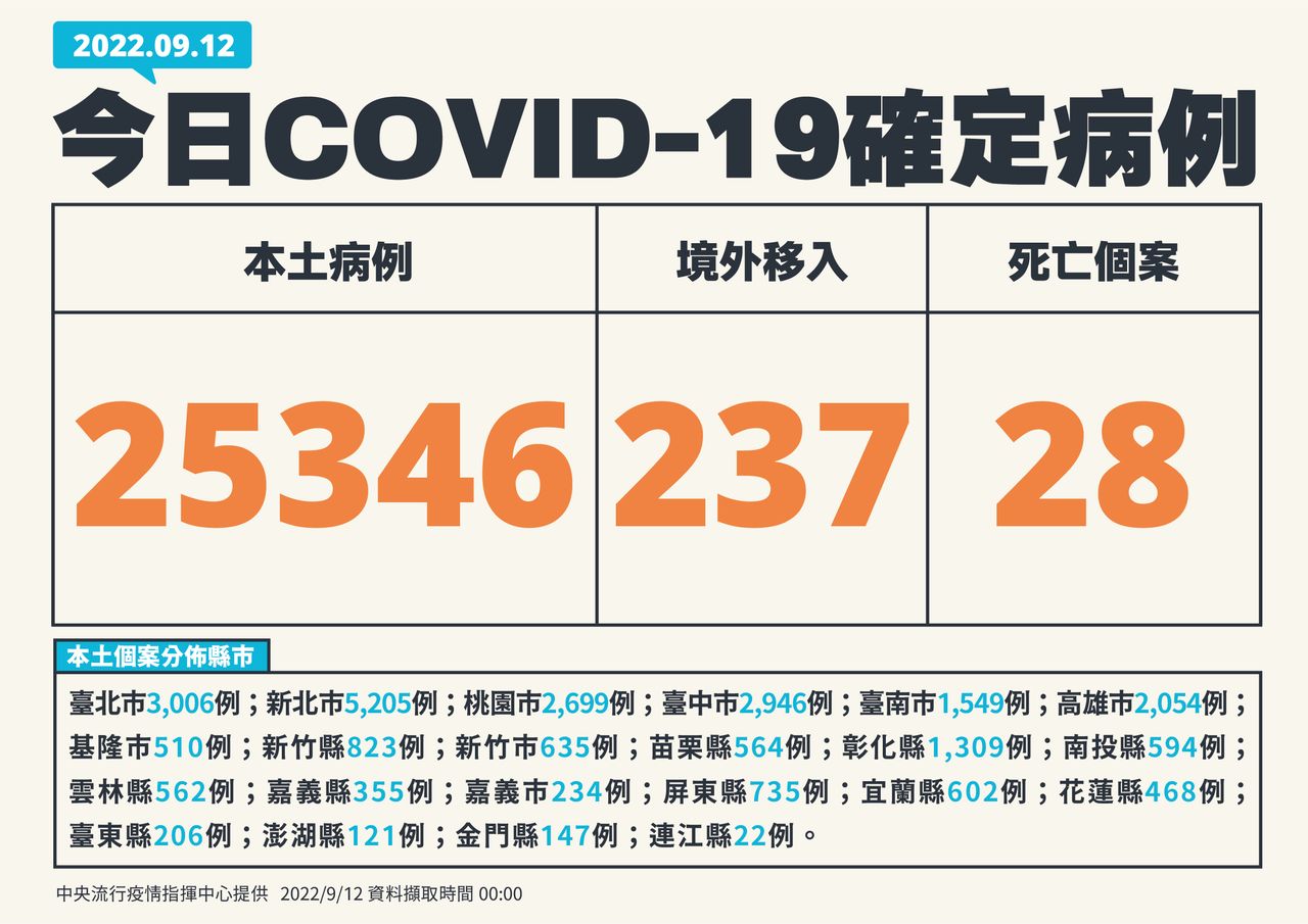 中央流行疫情指揮中心今公布國內新增25,346例本土個案,另增237例境外移入和28例死亡。本土個案以新北5205例最多,其次依序為台北3006例、台中2946例、桃園2699例、高雄2054例和台南1549例。