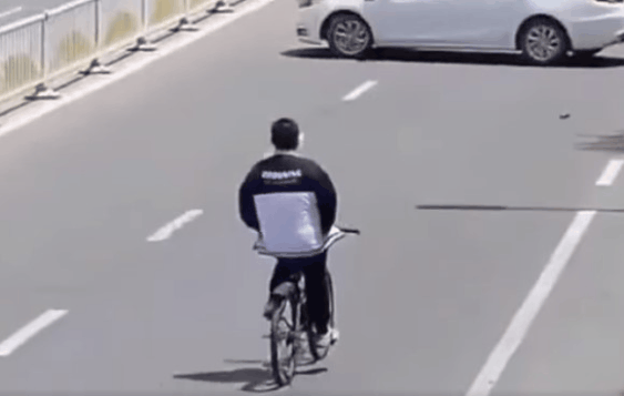 騎單車將雙手放開是一件很危險的事情,尤其是當前方出現緊急狀況時,無法第一時間反應,一名男子騎著單車在路上,將雙手放在口袋裡耍帥,怎料前方出現一輛汽車正在倒車迴轉,並且橫跨三個車道,男子手被卡在口袋裡出不來,還來不及轉方向就直直撞上汽車,影片曝光後網友大笑,「三寶大對決,療癒」。