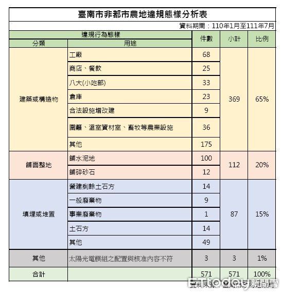 地政局長陳淑美指出,地政局分析2021年至2022年7月571件裁罰案,其中農地違規搭蓋建築或構造物占了65%(計369件),為最多的違規態樣;其次則是整地鋪設水泥或碎砂石等約占了20%(計112件)。陳淑美局長提醒,土地使用除了要符合用地的管制外,也要依用地主管機關的申辦程序提出申請,經主管機關核准後再來施設才合法。