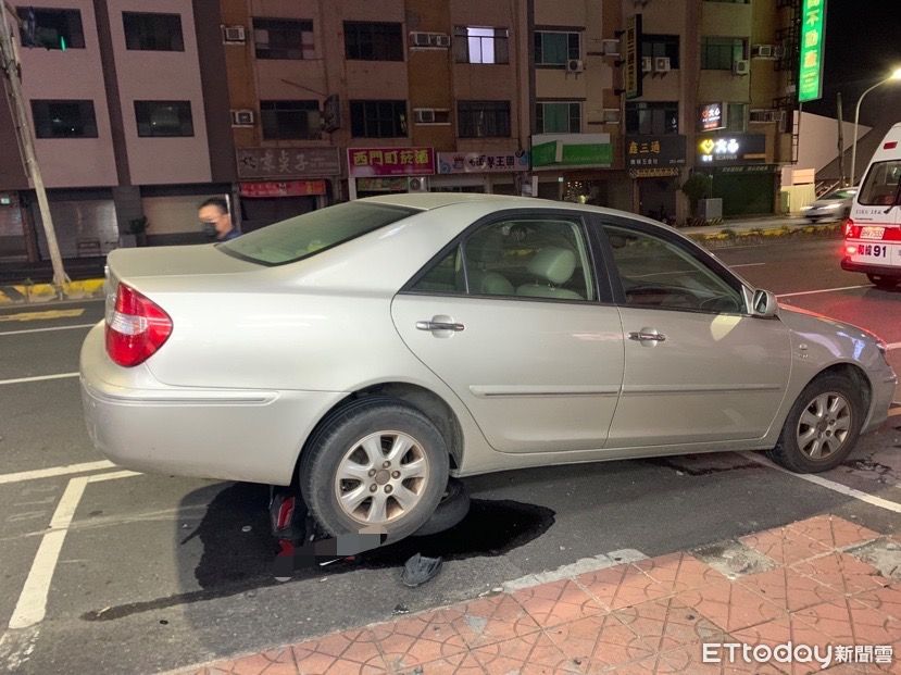 ▲台南市西門路四段與西門路四段330巷口,12日深夜發生機車車禍,機車竟衝撞滑入路邊停車的自小客車車底鏟起後車輪,雙方身體多處受傷送醫。(圖/記者林悅翻攝,下同)