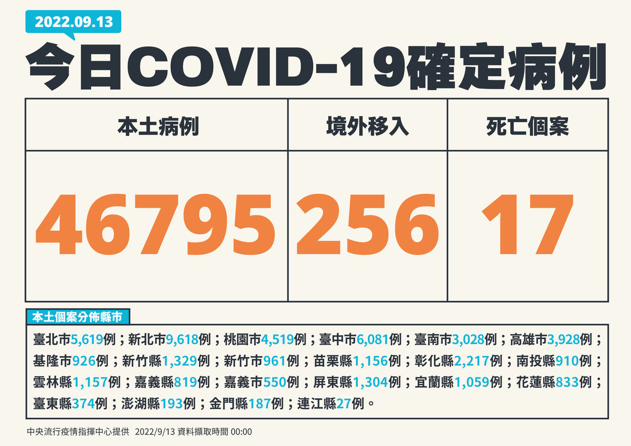 中秋連假後效應來了!中央流行疫情指揮中心今(13)日公布國內新增46795例本土個案,單日突破4萬例,成這波BA.5疫情以來單日最高,也是自6/23以來相隔83天再創新高記錄。今日另增256例境外移入,確診個案中新增17例死亡;新增通報56例中重症,無特殊重症、死亡個案。