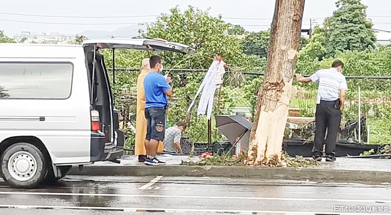 ▲桃園市八德區東勇北路昨晚發生2死1傷自撞路樹死亡車禍,家屬今天下午在現場招魂。(圖/記者沈繼昌翻攝,下同)