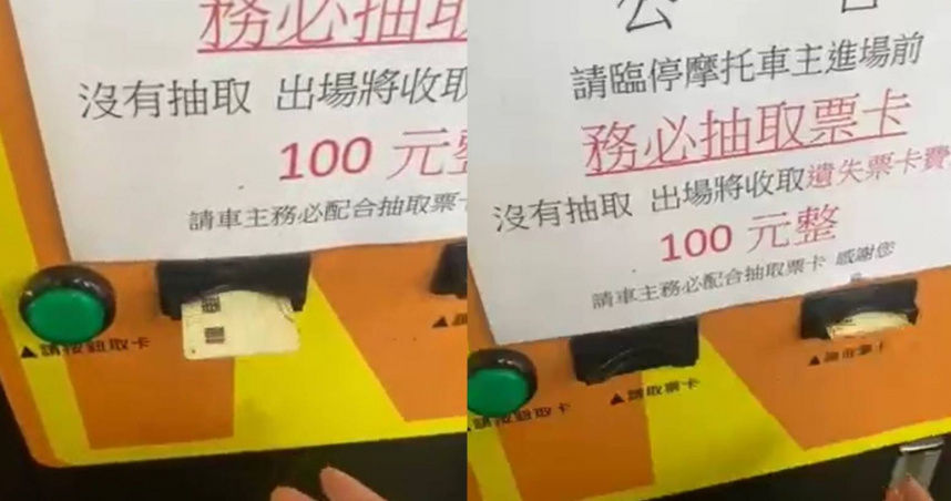 一名男網友在臉書社團「爆笑公社2」PO出一段影片,他前往某機車停車場想要停車,看到取票機上有2個出票口以及1顆取票按鈕,而取票機上也貼著公告「請臨停摩特車主進場前,務必抽取票卡,沒有抽取,出場將收取遺失票卡費用100元整」。不過取票機上的出票孔相當詭異,票卡才剛被吐出,下一秒卻又馬上被吸入,讓原PO相當慌亂,一直取不到票卡,心累喊「我只是想停車而已,不是要吃土耳其冰淇淋啦」。