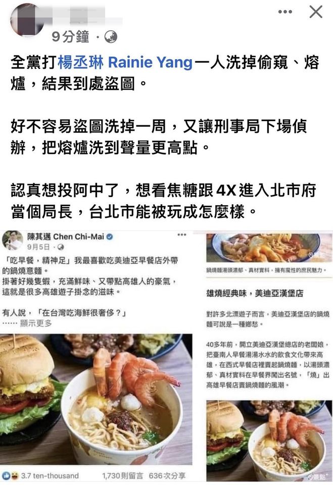 臉書粉專「一百五」發文指出,「全黨打楊丞琳一人洗掉偷窺、熔爐,結果到處盜圖,好不容易盜圖洗掉一周,又讓刑事局下場偵辦,把熔爐洗到聲量更高點。認真想投阿中了,想看焦糖跟4X進入北市府當個局長,台北市能被玩成怎麼樣。」粉專也貼出多張對比圖,包含陳其邁、王定宇的臉書貼文指同樣也盜圖。