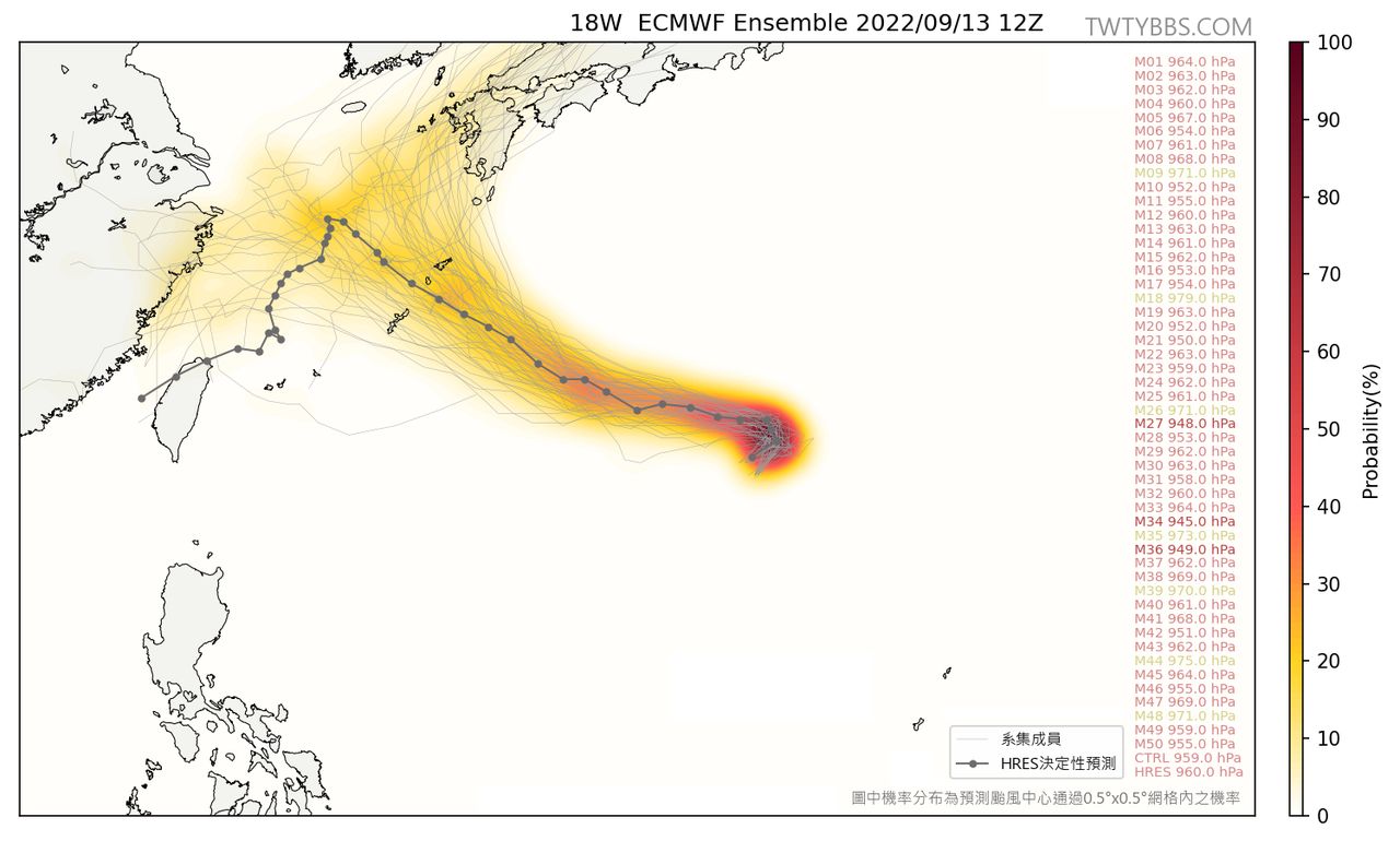 氣象局預報員黃恩鴻表示,針對南瑪都路徑,九成以上的系集預報都顯示,南瑪都將會在日本西南方北轉,只有最新一報的歐洲數值模式顯示路徑離台灣較近,不過這個機率不高,另南瑪都會持續增強,有機會在下週日、週一增強為中度颱風。