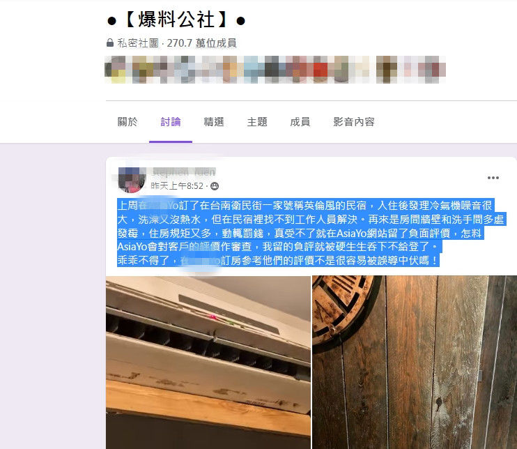 網友在爆由公社料指控稱:「上周在訂房平台訂了在台南衛民街一家號稱英倫風的民宿,入住後發理冷氣機噪音很大,洗澡又沒熱水,但在民宿裡找不到工作人員解決。再來是房間牆壁和洗手間多處發霉,住房規矩又多,動輒罰錢,真受不了就在訂房平台網站留了負面評價,怎料訂房平台會對客戶的評價作審查,我留的負評就被硬生生呑下不給登了。乖乖不得了,在訂房平台訂房參考他們的評價不是很容易被誤導中伏嗎!」