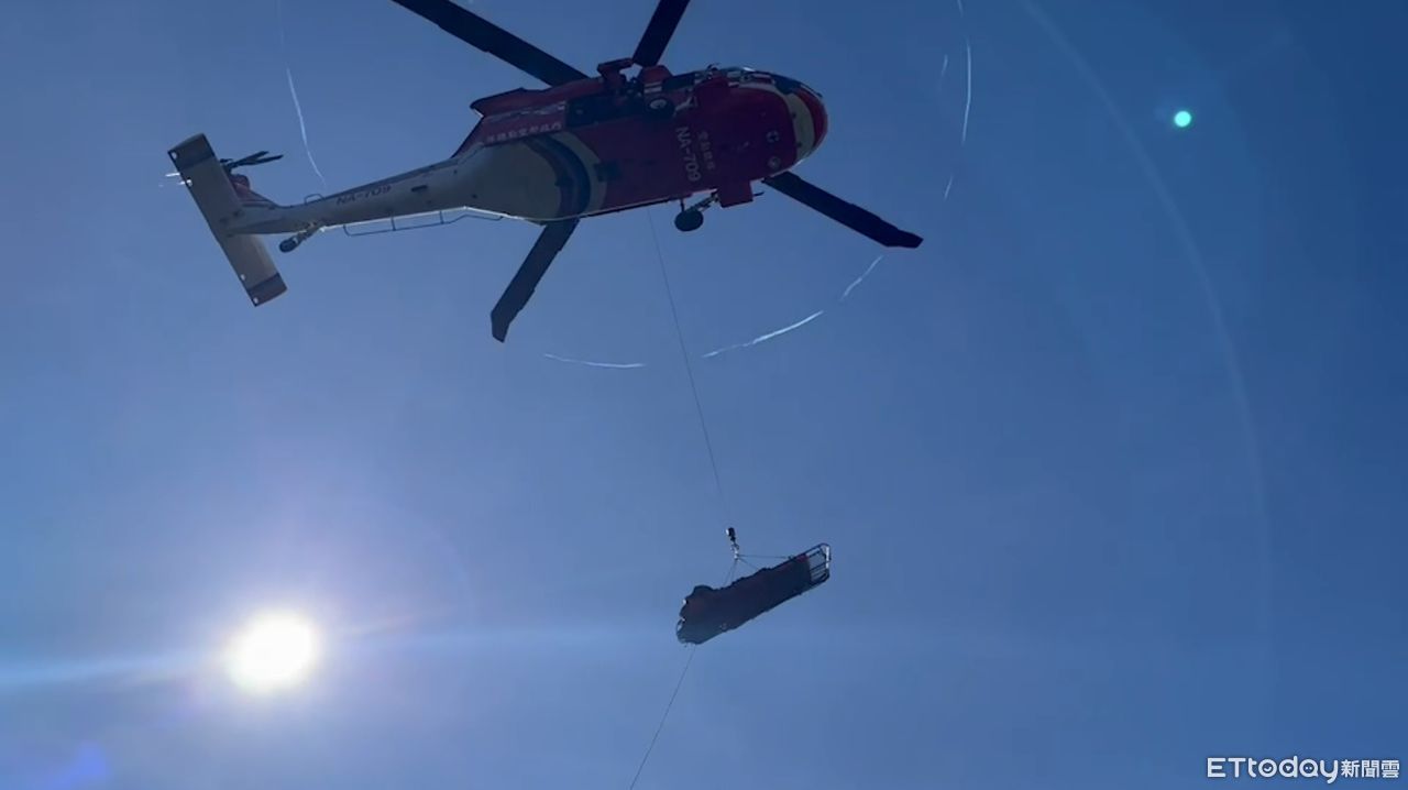 現場畫面拍下,今天氣晴朗少雲,3名搜救人員在碎石坡上架設繩索、擔架,並將遺體吊掛上直升機,在完成吊掛後,直升機隨後飛往東勢河濱公園。