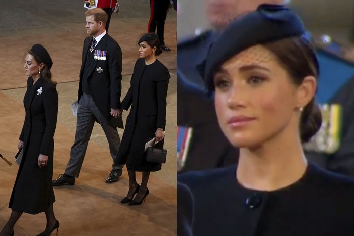 英國媒體形容,穿著軍裝的威廉王子,還有穿著「晨禮服」的哈利王子走在女王靈柩後方的模樣,像極了當年在母親黛安娜王妃葬禮上,兩人一起走在棺木後的樣子,場面十分哀悽。隨後他們和妻子並肩一起走入西敏寺大廳,但這時梅根的一個臉部表情,又再度惹來罵名。