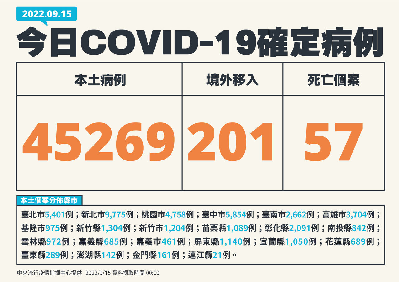 中央流行疫情指揮中心今公布國內新增45,269例本土個案,另增201例境外移入和57死亡。本土個案中有12個縣市確診破千,其中以新北市9775例最多。