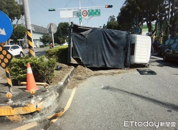 曾姓男子15日駕駛大貨車載著砂石,自稱因剎車失靈失控,為免追撞其他車輛造成更大傷害,緊急採取應變衝撞安全島後翻覆,但傾洩的砂石仍波及一旁休旅車,所幸這起車禍僅曾男受擦挫傷,肇事原因正由警方調查中。
