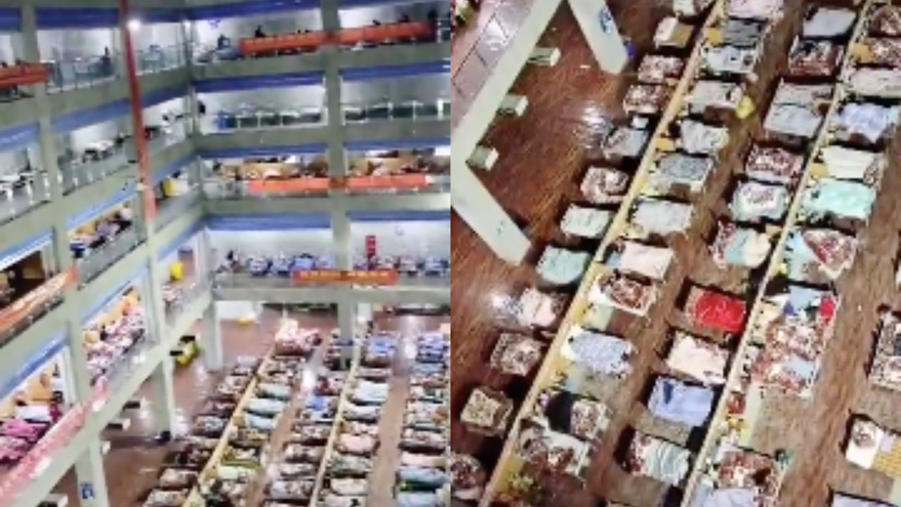該段18秒的影片顯示,一棟6層樓的建築物當中,幾乎每層都擺放著整齊劃一的床鋪,而且都住著陽性病人,1層的大空間人最多,目測有上百名患者。