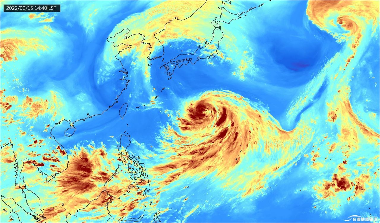 氣象粉專台灣颱風論壇|天氣特急貼出「南瑪都」的水氣雲圖,可見南瑪都整坨都是潮濕的「橘紅色」水氣,貼文指出,「西南季風延伸到西北太平洋,讓南瑪都獨享大量水氣能量,目前穩健增強中,未來範圍還會再擴大」。