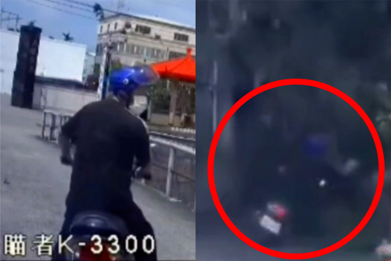 接著駕駛趕緊開往朴子街565巷轉進東北街,以為已經跟騎士分開,不料騎士突然從左側追上高速竄出,接著連人帶車往一處邊坡草叢撞去,發出巨大聲響,整個過程都被駕駛行車紀錄器拍下。