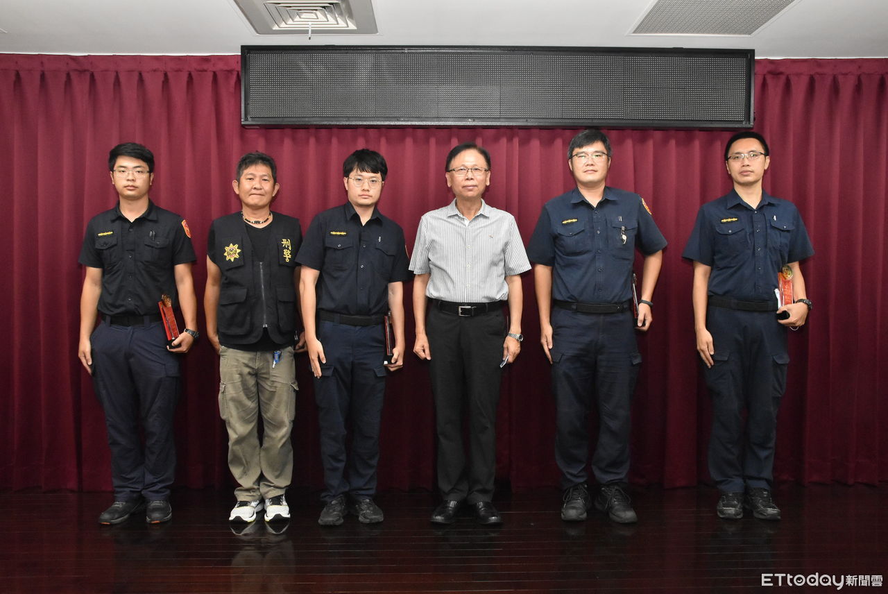 ▲台中警方舉辦協尋人口評比,副局長鄧學鑫和前5名合照,沈修安、高振銘、蔡宏旻、陳宏霖、洪佳碩(左至右)。(圖/警方提供)